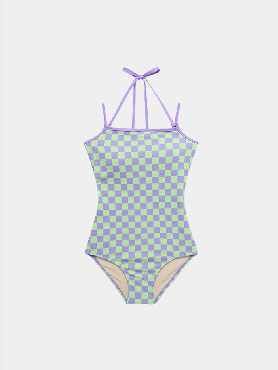 Make a bold statement this summer with the Pool Party Check Purple & Green One-Piece Swimsuit! Featuring a vibrant checkered pattern in trendy purple and green, this eye-catching design is perfect for those who love a playful yet stylish look.